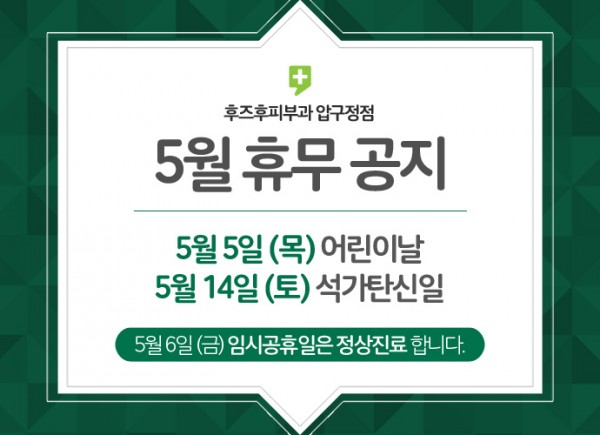 [공지] 5월 진료(휴무)안내 페이지 정보 작성자 통합관리자 작성일16-04-29 12:14 조회2,311회 댓글0건 관련링크 이전글 수정 삭제 목록 본문 댓글목록 등록된 댓글이 없습니다. 이전글 수정 삭제 목록