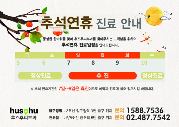 [공지] 추석연휴 진료안내 페이지 정보 작성자 통합관리자 작성일14-08-20 11:45 조회2,057회 댓글0건 관련링크 이전글 수정 삭제 목록 본문 댓글목록 등록된 댓글이 없습니다. 이전글 수정 삭제 목록