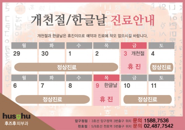 [공지] 개천절/한글날 진료안내 페이지 정보 작성자 통합관리자 작성일14-09-30 16:57 조회2,722회 댓글0건 관련링크 이전글 수정 삭제 목록 본문 댓글목록 등록된 댓글이 없습니다. 이전글 수정 삭제 목록